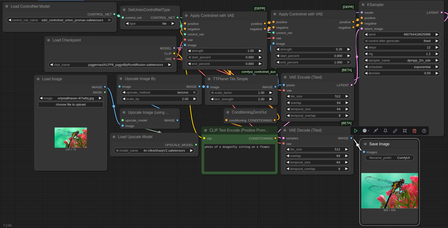 If you want to use the workflow, you can either drag & drop the image at the top or the image below into ComfyUI, or you can just download it here: with Florence2 & CLI (Command Line Interface)P vision or without the extras . I tested it only with ComfyUI commit 0963493a9c3b6565f8537288a0fb90991391ec41 , but I'm sure it will work with other commits. Apart from standard ComfyUI, I used a node from https://github.com/Fannovel16/comfyui_controlnet_aux . For the larger workflow, you also need https://github.com/kijai/ComfyUI-Florence2 . And you also need models, i.e. the neural networks: clip_vision_g.safetensors , Florence-2-base (although I believe Florence2 requires Huggingsface's annoying autodownload feature) , 4x UltraSharpV2 , SDXL Union Promax Controlnet , Juggernaut XL (version Jugg XI) .